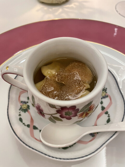 ぎたろう軍鶏を丸ごと一羽煮出した"ブロード"、カペレッティ、白トリュフ