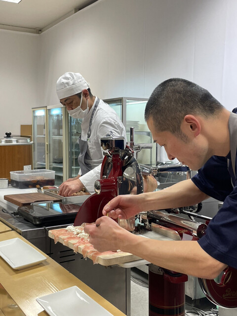 コースは二部制で第一部では季節の食材を使った前菜やパスタ、魚料理や肉料理をいただきます。その後第二部で目の前でスライスされる生ハムを様々な食べ方で味わいます。