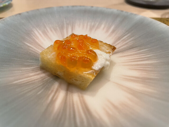 備長炭と藁で瞬間燻製した自家製イクラ、マスカルポーネのトースト