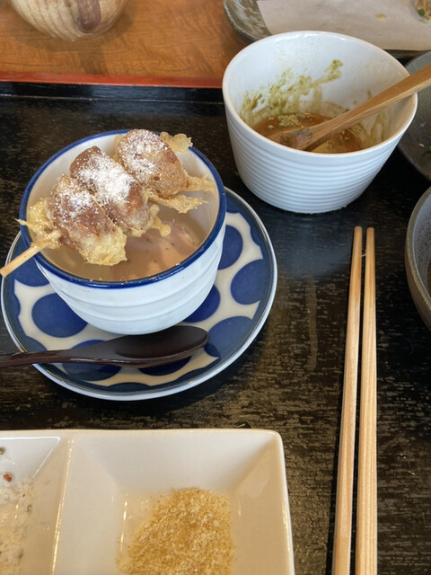 味、接客、お店としての営業仕様、コンセプト すべてに於いて文句なしの圏外です。開店10分過ぎ入店、早や客カウンターに一名。二色せいろ、天麩羅付き2500円注文。前のお客様に丁寧な説明しながら手際良く天麩羅おだししてます。暫くして漸く私の番!すでに塩三種、薬味(葱。おろし、わさび漬け?)天受け皿。天受け皿にエビ半身、そしてその海老の殻の天麩羅。美味しいです。それから茄子、おろし乗せて天つゆで。蕎麦がきました。板にせいろと桜の塩漬けが乗ってる桜せいろの2枚盛り。量も充分。桜の香り鼻腔にひろがります。その間、白身魚、蕗のとうの天麩羅、食べ終わる頃に海老一本。ながれるような提供で、満足!蕎麦湯頂いたところにデザートわらび餅、これで終わりかと思ったら、更にアイスのおかれた器に串差しの洋菓子?の天麩羅。ご主人と奥様?とのお仕事に対する姿勢に感謝です、それにしてもあれだけ丁寧な仕事と流れでは一日何人に提供出来るのか、売り上げ的にあうのか心配してしまいました。有難う!美味しかったです!