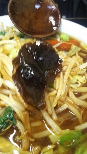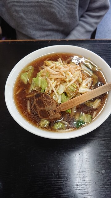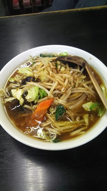 ちょっと待って ご対麺です♪ 先に女房さんの野菜ラーメンです♪ 一口もらいました♪ 見ためは 茶色く 炒めた野菜が たっぷりです♪ モヤシがシャキシャキ(^^)d これは 野菜炒めとライスで ガッツリ食べたいね♪(σ≧▽≦)σ