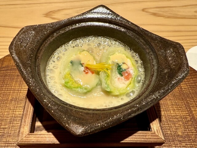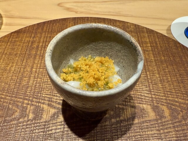 擦り潰した海老芋に海老の出汁を混ぜて素揚げしたものに、自家製のカラスミがかかっています。超絶おいしかったです!自家製のからすみはからすみ用の別室で作るほどのこだわり!大将の本気を感じます!!