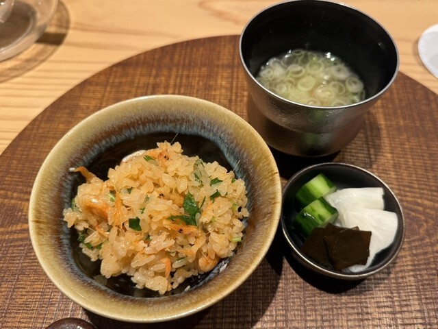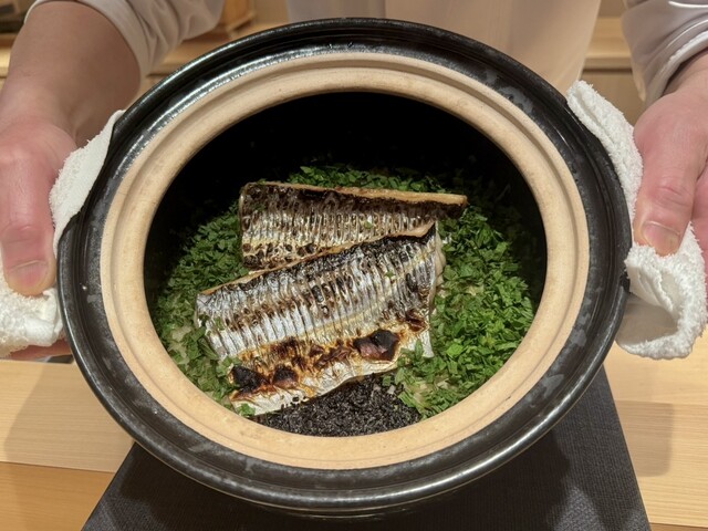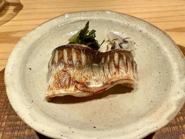 大きくて肉厚なかますに、新鮮な牡蠣と菊菜のお浸しが添えられていました。かますの身はふっくらふわっとしていて素晴らしい火入れ加減です!牡蠣と菊菜のお浸しもめっちゃおいしかった!!