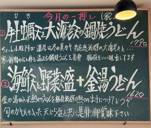 私が食した鍋焼うどんは、口の中が火傷注意!と言わんばかりにぐつぐつした状態で運ばれてきました。牡蠣天も大海老天も抜群に美味しかったです。お出汁ははじめ『ちょっと薄い?』と感じましたが食べやすい温度になった時にはちょうどいいあんばいで汁も残さず完食。
