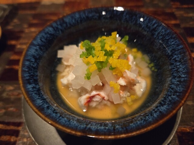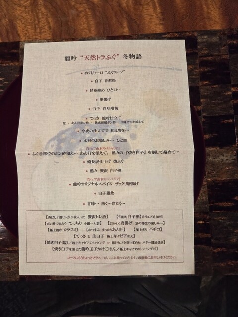 コースの中には白子料理が沢山あり、極厚のてっさのほか、3層とあると言われる皮の「みかわ」、「とうとうみ」まで食べ応えがある料理に仕立てられており、本当に美味しかったです。