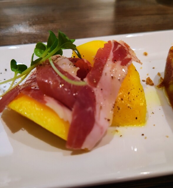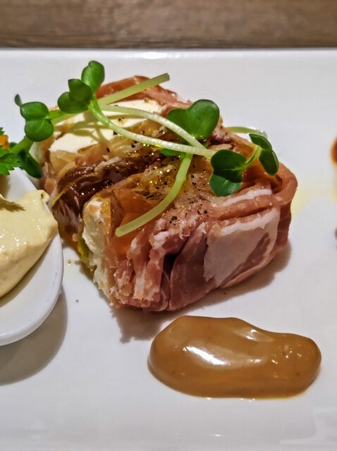 前菜テリーヌは、生ハム、ズッキーニ、とうもろこし、チーズで、こちらもウニのパンナコッタに負けない美味しさで感動しました(///ω///)♪