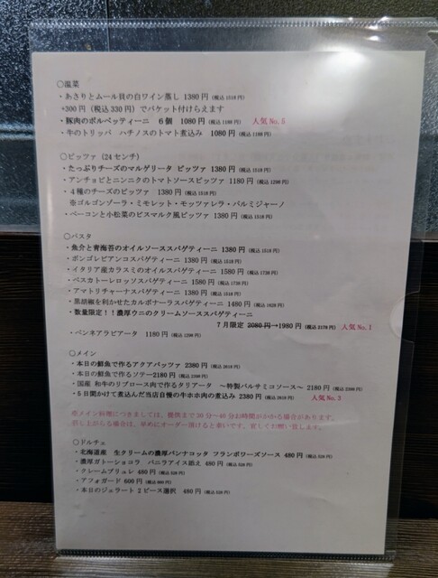 大森山王にある町イタリアンです。久しぶりにオンタイムでメニュー写真をつけました。