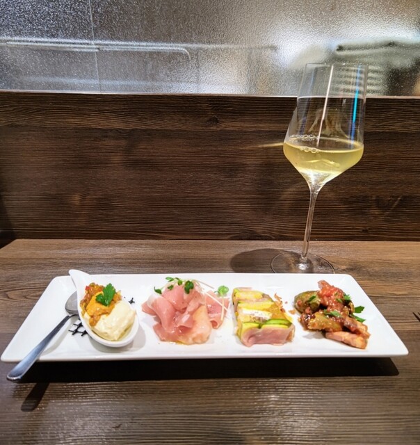 ウニのパンナコッタ、赤エビのマリネ、マグロのテリーヌ、生ハムカマンベールチーズ