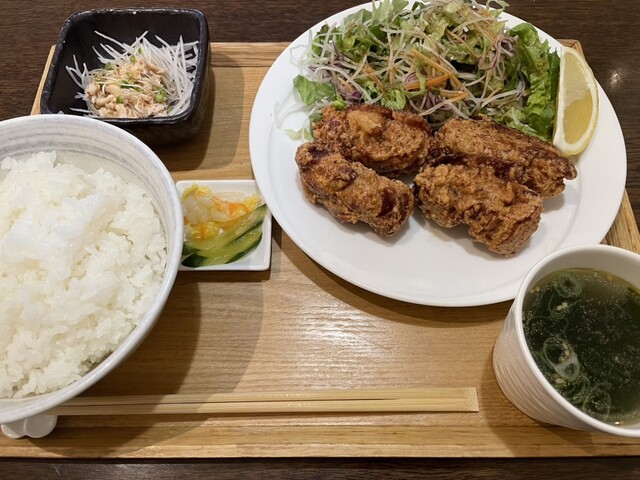 ・から揚げランチ…肉質・揚げ加減が丁寧で旨味がしっかりしている。程よいジューシーさと食べ応えのある仕上がりで、付け合わせのサラダ・ライス・スープとバランス良いセットに。