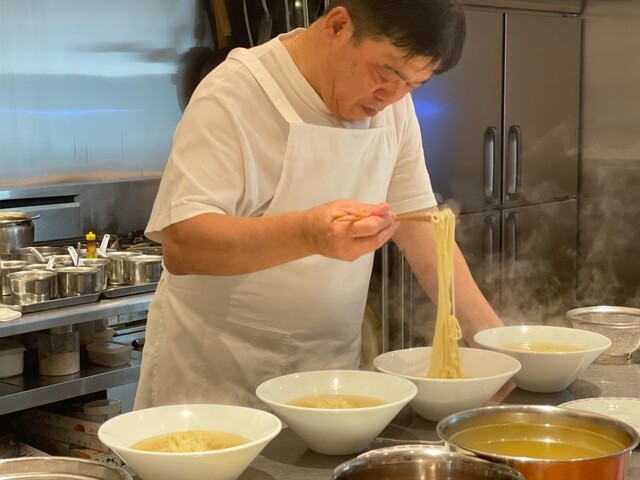 チャーシューは金華豚の肩ロース。焼いて一晩寝かせている。肉汁が多いのでスープの味が変わらないようにしているらしい。