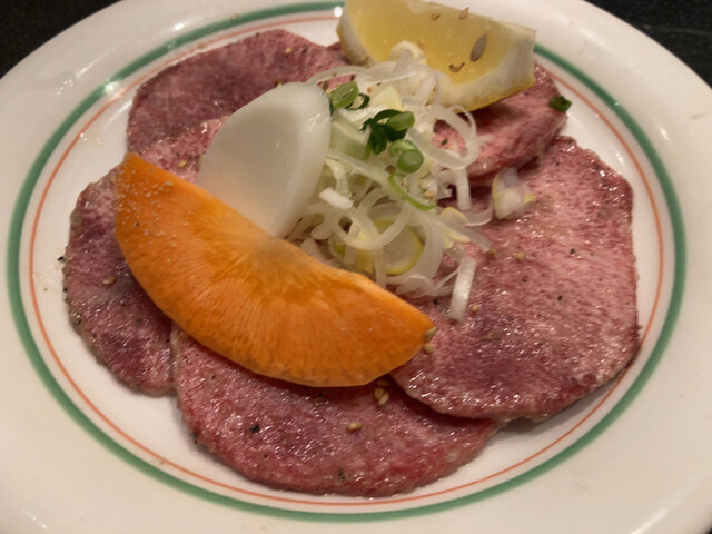 今回は特上ランプ、特上ロース、特上タン塩、ハラミ、ハラミスジ焼き、上ミノ、レバー、ハツ、サンチュサラダ、ビール2杯、大ライス2杯。