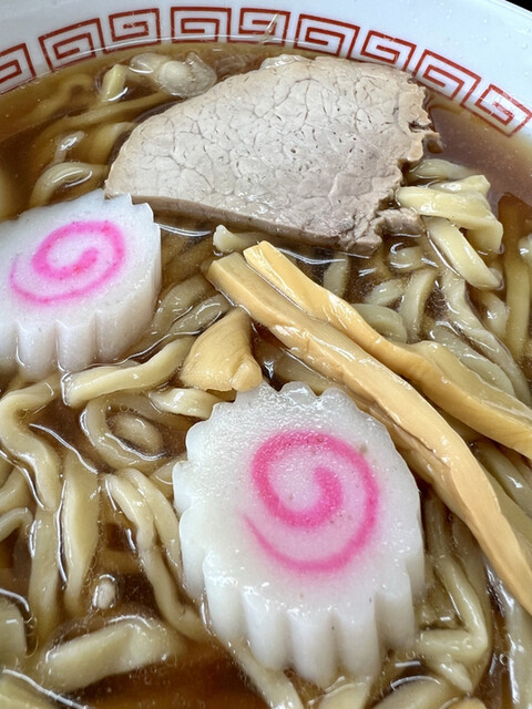 具材は、分厚いナルトが2つ、メンマに海苔、チャーシューに青菜。