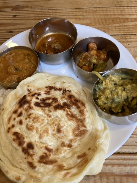 やはり日曜はポロタという少しあまめの丸いなん?が売れ行きいいですので私も焼きたてに1枚、しかし、最近高騰気味の白米がカレーソースにあう。いわゆる日本のご飯に本格派のインドカレーソースを4種かけて食べられます。