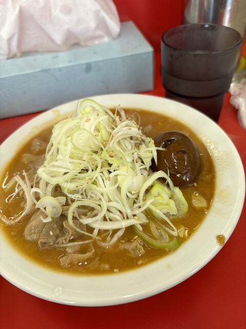 次にモツ煮込み。大きさバラバラで面白い。シロモツがたっぷりです。ニンニクも少し効いていて好きな味!真っ黒になるまで味を染み込ませた煮卵が秀逸。中身はトロンですが味がしっかり染みていて美味しい!