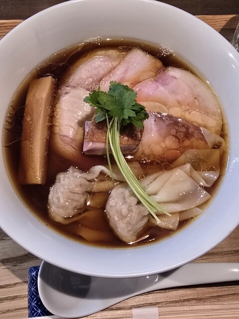 はじめにスープを口に含むと芳醇なコクと旨味がお口いっぱいに広がりました。柔らかめの中細ストレート麺とのマッチングも良好で、具のチャーシュー・メンマ・雲呑・青物もスペシャルでした。特にチャーシューは鶏と豚が何枚も入っていてとても味わい深かったです。