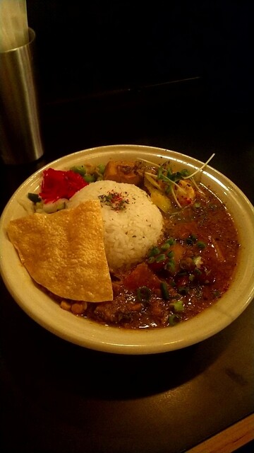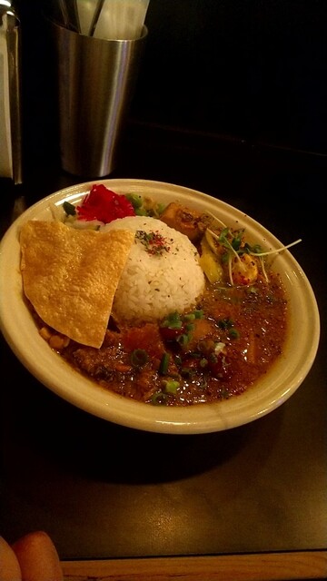 片方のメニューは覚えてないが、烏賊の入った魚のカレーと根菜筑前鶏キーマの2種盛が凄く美味しくて驚いた。辛さは殆どないが、スパイスが合わさって良い感じ。もともとお目当てのお店に振られた後に寄ったので、代打でホームラン打ったようなものだったな。
