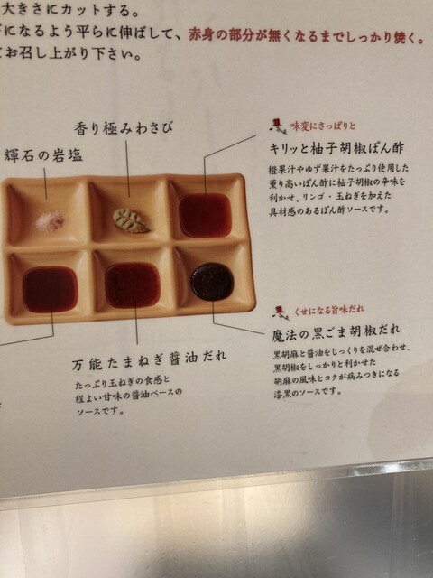写真にあるようにタレは何種類かあるのですが、お肉が美味しいので何もつけなくても美味しかったです。あえていうなら個人的にはポン酢がさっぱりしていて良かったかな。今度は友達をつれて来たいです。