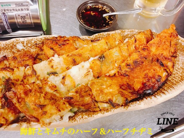 チヂミは、キムチと海鮮のハーフ&ハーフを注文〜