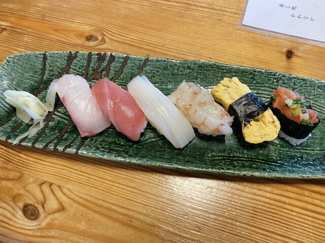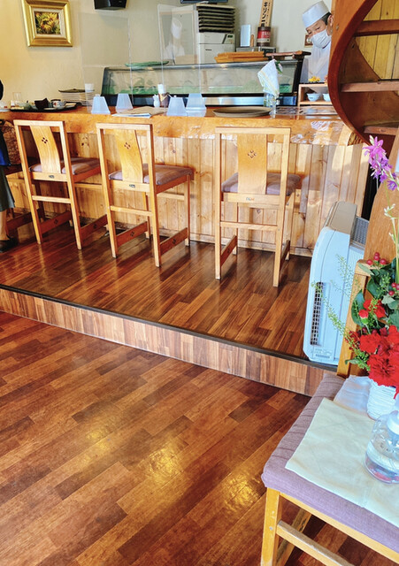 外観はログハウス的な建物でポップだけど、お寿司屋さんなのでカウンターにお魚のショーケース。店主さんも板前さんの白い調理服。よっ!