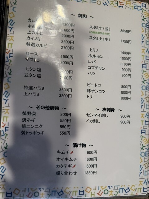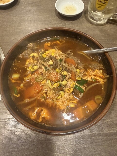 お酒を2-3杯ずつと上タン塩2、特選ハラミ1、ハラミ1、ライス1、ユッケジャンスープ1で、1万6千円弱でした