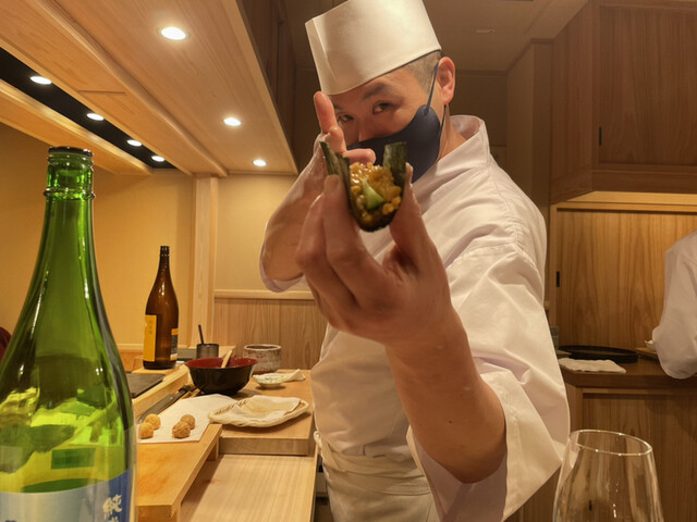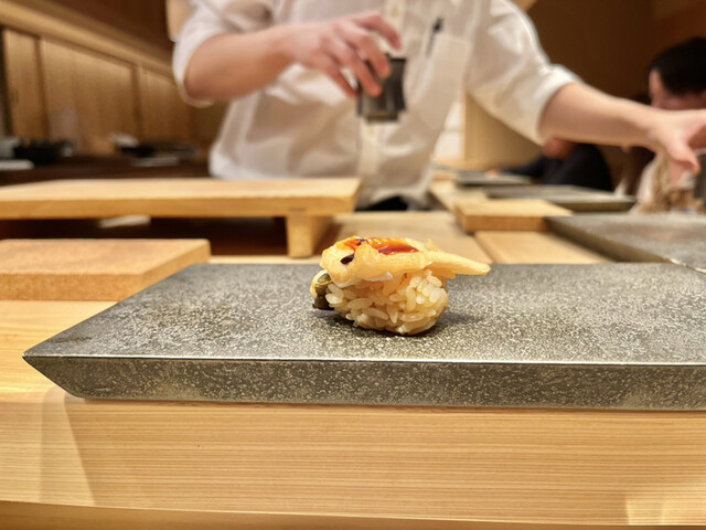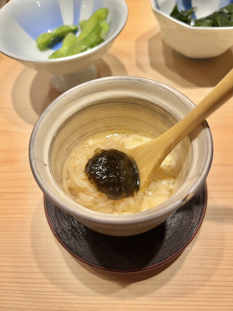 さて、とうもろこしの甘みが強い嶺岡豆腐から始まり、茶碗蒸しに酢飯と海苔の佃煮を入れたご飯ですよは定番の流れ。