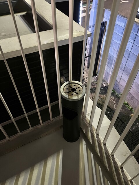 お店を出て外階段の中階(踊り場)にあります。