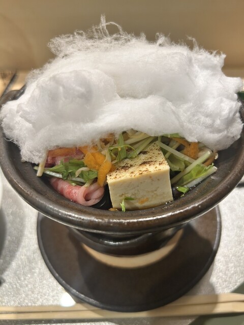 宮城「黄金澤 斧琴菊」純米大吟醸を合わせつつ、車海老のプリプリ感、北海道産ばふんうにの濃厚な甘み、天ぷらの鯛の大葉包み、金目鯛の炙り、のどぐろ小丼、そして綿菓子を添えたすき焼き風小鍋と、どの料理も趣向が凝らされ、まさに“鮨のフレンチ”のよう。さらに宮城「秋綿」純米吟醸で締めに向かい、中トロ・赤身の漬け・トロたく巻の三連発、そして自家製プリンで大満足のフィナーレ。