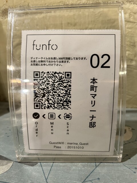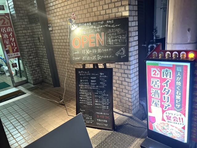 仕事帰りに、本町駅近くの「石窯イタリア居酒屋 マリーナ邸」さんを2人で訪問。料理と飲み放題付きで5,000円のコースをいただきました。まずは時間のかかるピッツァを先に注文。指定メニューの中からどれも魅力的で悩みましたが、今回はお店オリジナルの「チーナ」をチョイス。QRコードでスマートに注文し、生ビールとスパークリングワインで乾杯。お通しのグリッシーニはおかわり自由で、お酒が進む美味しさ。