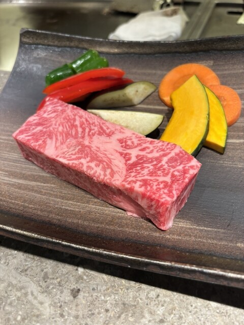 海鮮も「穴子」、そして「鮑の鉄板焼き」と、高級食材のオンパレード!どれも火入れが絶妙でした。特に鮑は水槽から上げたばかりのものを目の前で即焼く、ライブ感が凄い!そして味も最高においしかった! そして以外にシンプルながら美味しいのがチーズ焼き、ただチーズを焼いただけなのですが、これがおつまみに最高!!さっぱりと葡萄酢口直しをした後は、メインの「和牛サーロインステーキ」。こちらはトリュフ醤油と白醤油でいただきます。上質な脂の甘みを、香り高い醤油が引き立ててくれ、至福の味わいでした!