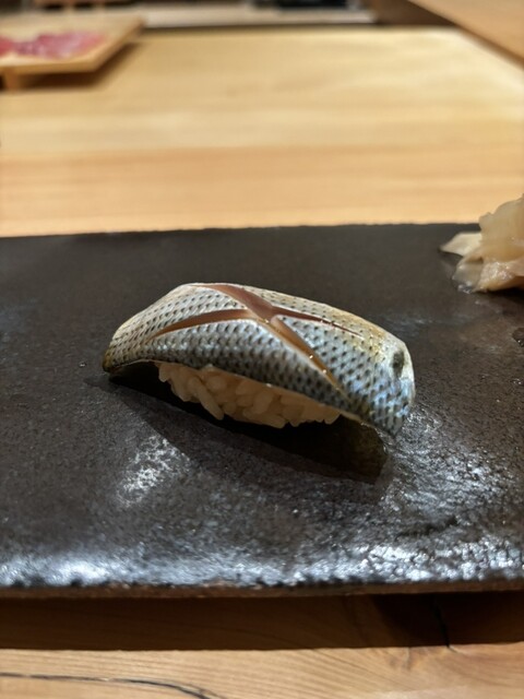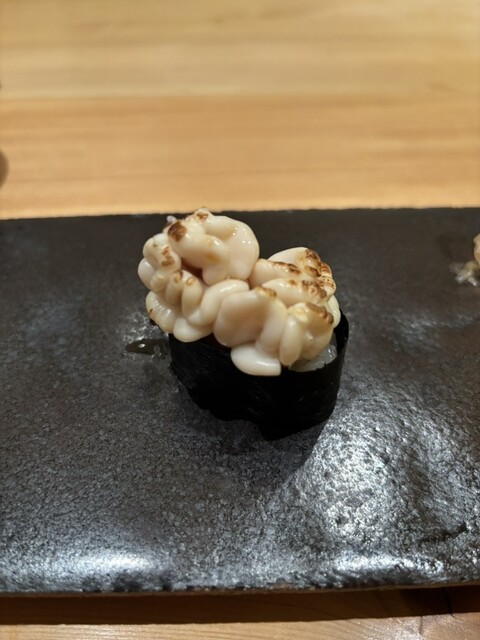 いよいよ握りへ。 こちらも1週間熟成させたという「金目鯛」は、香りと甘みの余韻が長く、塩と酢橘でいただく「スミイカ」はパツッとした食感が心地よい。 ここでたまらず日本酒「伯楽星」をオーダー。食中酒としての相性が完璧です!