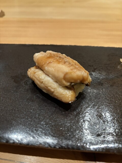 「コハダ」の良い締め加減、箸休めの「胡瓜の浅漬け」でリセットした後は、怒涛のマグロ3連発!「赤身漬け」「中トロ」「大トロ」と、部位ごとの脂の甘みと香りの違いを堪能し、幸せの絶頂へ。 「シマアジ」「煮ハマグリ」と続き、お酒も「田中六五」へスイッチ。後半戦の「白子」「雲丹」「穴子」という濃厚な波状攻撃を、しっかりとした旨味の酒が受け止めてくれます!