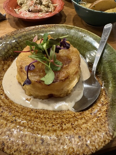 →セリの根を素揚げしてくれてる。イカ、せり、根っこ、オイル。たまらない。美味しすぎる。