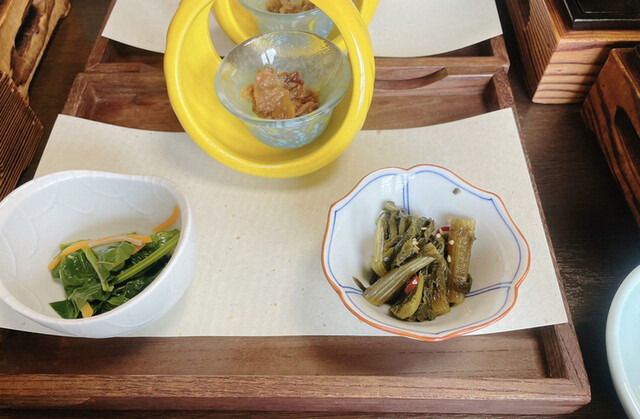 こしひかり美味し!味噌汁は山椒が効いていた。漬物もおいしかった