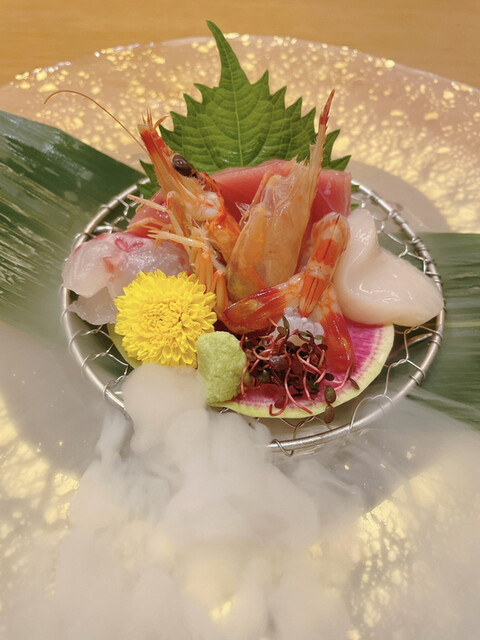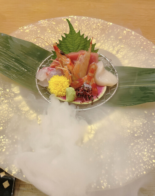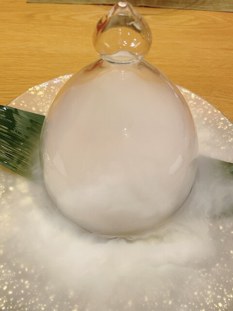 ドーム状のガラスの蓋で覆われていた。中はスモークで見えない。蓋を開けるとドライアイスのスモークが流れて、お造りが姿を現した!