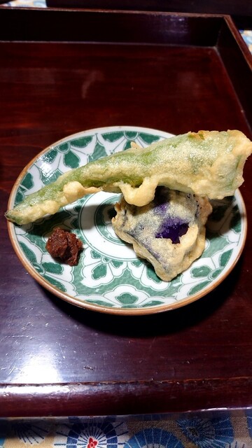 そして、更にナスと万願寺とうがらし?みたいなやつの天ぷらが出され、味噌で食べてとの事でしたので味噌で天ぷらというのを初体験