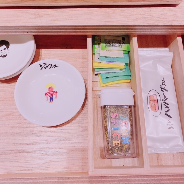 店内はカウンター席がメインになっており、目の前に鉄板スペースがあります。引き出しを開けると、お箸やおしぼり、可愛い絵柄の小皿が入っています。