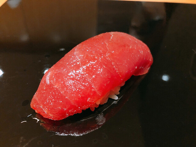 口に含むと脂と身のバランスが非常に良くて美味。この時期はどこでも那智勝浦の鮪が供される事が多いが、個人的な好みで言うと、脂が多すぎる那智勝浦産より沖縄産の方が口に合った。