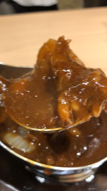ハヤシはルー増しにしなくても基本でカレーポットいっぱいの量で供される。トマトや玉ねぎ牛肉をたっぷりと使いコトコト煮込まれたルーはカレー同様の濃厚かつ牛肉の旨味が極限まで引き出されていて、深い味わいだ。一般的なハヤシライスはややトマトの酸味を感じることもあるが、一体感のハヤシライスはトマトの風味は感じるものの、酸味はほぼ無くマイルドな仕上がり。この辺に店長のこだわりを感じる。