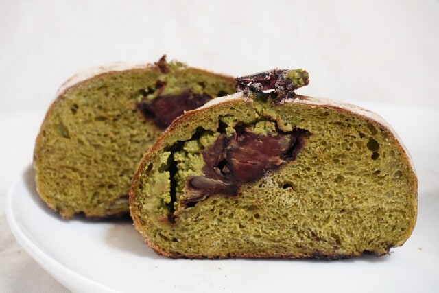 抹茶の苦味と香りがしっかりの抹茶生地に、抹茶クリームチーズと渋皮栗がゴロゴロ。秋のパンで一番のお気に入り❤︎