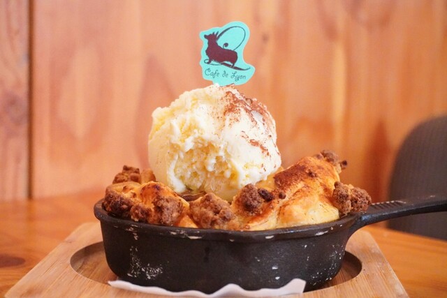 上には、たっぷりの自家製バニラビーンズアイス、サクサクのクランブル、シナモン。