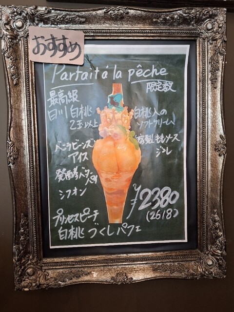 最高級白川白桃2玉以上、白桃入りソフトクリーム、北海道生クリーム、バニラビーンズアイス、発酵バターパイ、シフォン、桃ジュレ、桃ソース、北海道ヨーグルトetc...