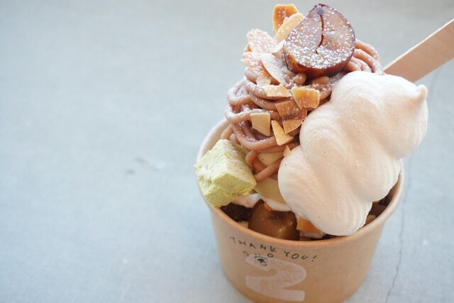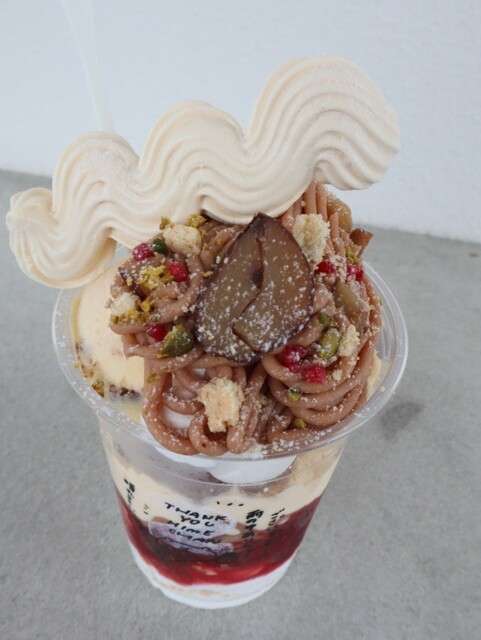 サクサク焼きメレンゲ、栗の渋皮煮、フランボワーズ、濃厚なモンブランクリーム、2種類のアイス、ホイップクリーム、カスタードクリーム。