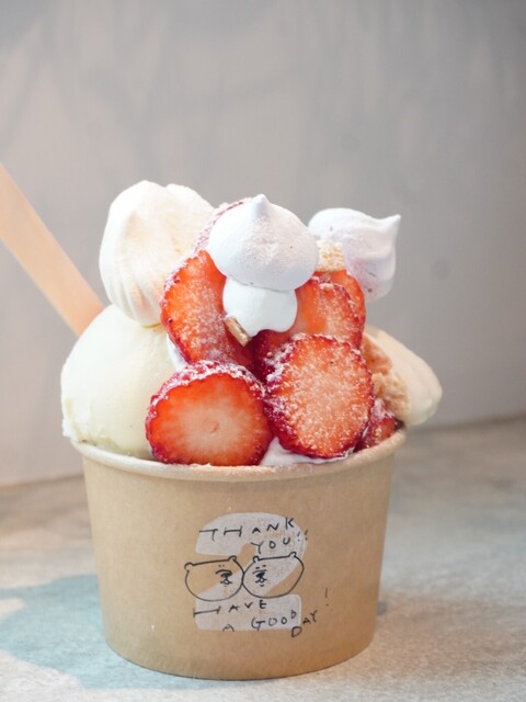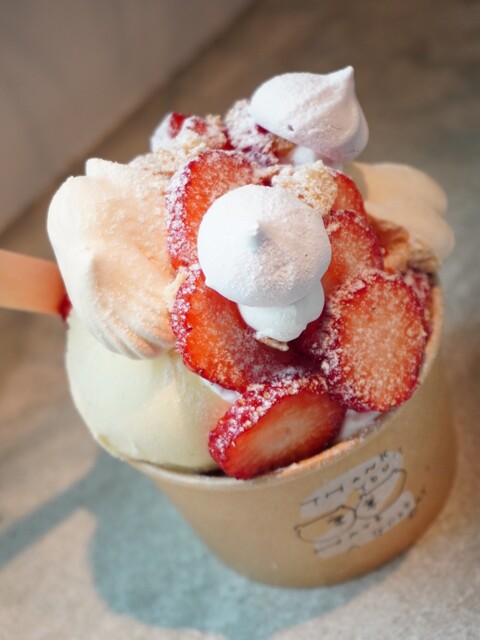 たっぷりの甘い苺、バニラアイス、サクサクのメレンゲ、クリーム、苺ソースetc…