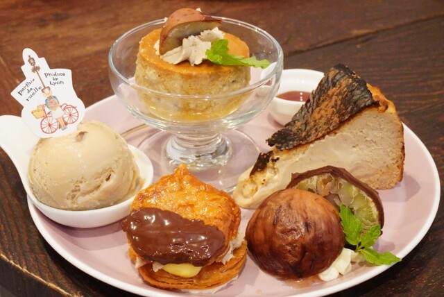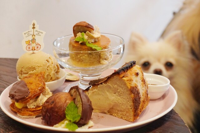 とろとろクリーミーなマロンバスク、とっても大きなマロン煮、見た目も可愛いミルフィーユ、渋皮栗アイスクリーム、渋皮栗クリームものったレトロなマロンプリン。栗尽くしのお洒落で可愛いプレート♡