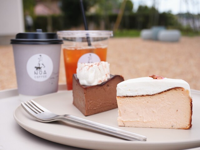【2024.04】桜のバスクチーズケーキ、ショコラバスクチーズケーキ(各税込680円)、ウィークエンドシトロン(税込380円)、和紅茶・ice(税込550円)、NOAブレンド・hot(税込550円)