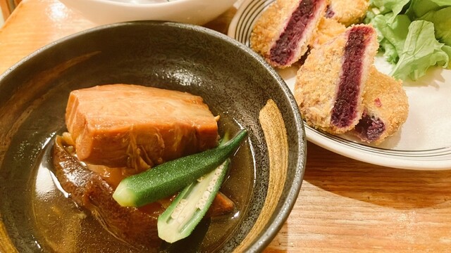 ラフテーは色々なお店で食べてきましたが、食べ応えのある大きさと甘い照りのきいた味が最高です。紅芋コロッケも音がザクザクするほどカリッと揚がっていて、二人でもりもり食べてしまいました。