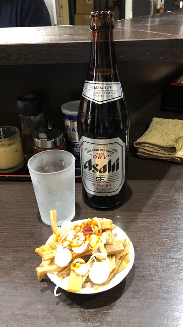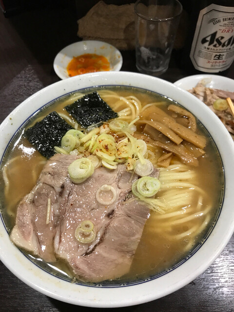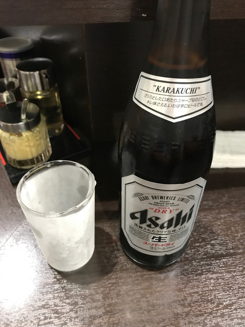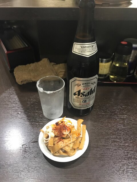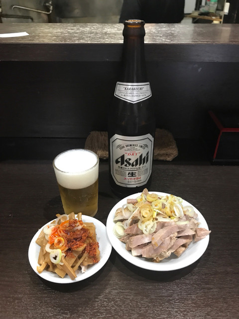 最近の投稿写真がラーメンが多いようなんで、私も倣ってみます。いつものようにスーパードライから。着席後兄ちゃんがすぐ出してくれました。あ〜美味い!不良リーマンですみませんm(_ _)m
