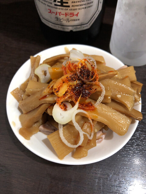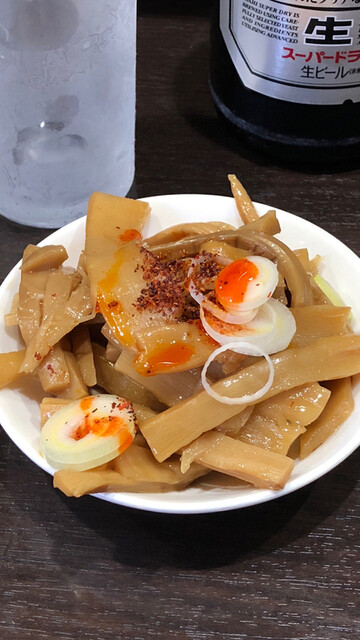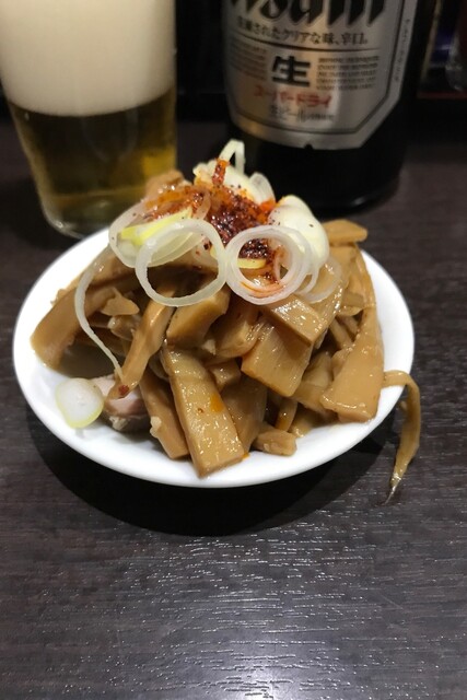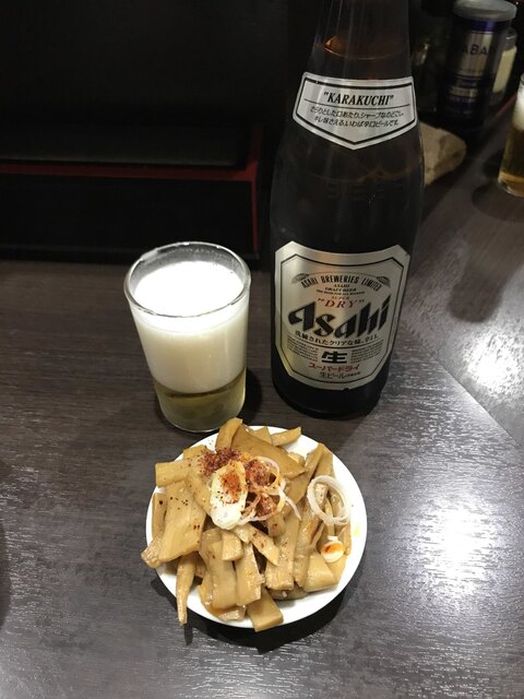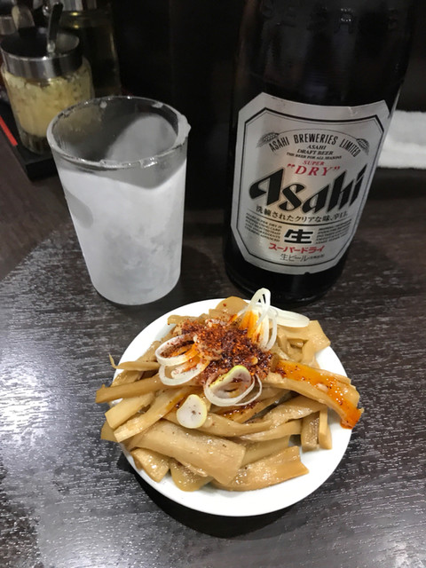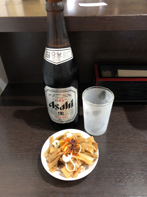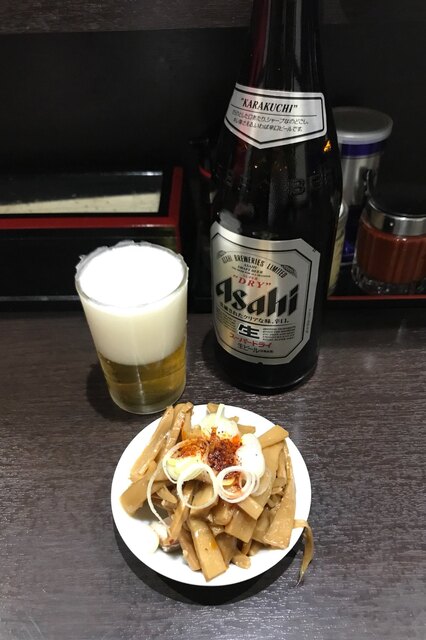 メンマトッピングは要らないかな。ここのスーパードライは初ですが、つまみとコップがキンキンに冷えていることから皆んなが言うようにサイコー!