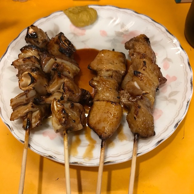 やきとんは四本以上縛りのビラが貼ってあります。なんせ65円ですよ、65円!これこそ経営努力です。値段にしては十分なボリューム。やっぱりやきとんは庶民の食い物、チープさだ!たれは甘過ぎず潔い。カラシも付けてもらい極上。ここのやきとんはホントに美味いです。雰囲気もあるけどね。もう少し食べたいけど今日は他も寄りたいので4本だけ。