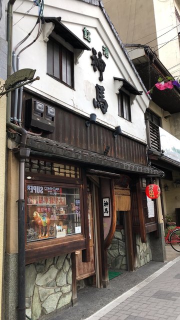 千本中立売の交差点から店が見え建物自体に感動。銘酒神馬の字が期待が込み上げます。太田和彦氏の居酒屋本で散々登場し、いつか行ってみたいと思っていたこの店で今日は飲みます!(゚∀゚)